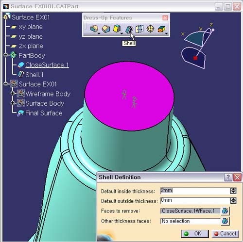 1. Shell ÀÛ¾÷Çϱâ (µÎ²² 2t ·Î ³»ºÎ¸¦ ÆÄ³½´Ù.) Shell ¾ÆÀÌÄÜÀ» ¼±ÅÃÇÑ´Ù. Default inside thickness : 2mm Default outside thickness : 0mm Faces to remove : °á°ú¹°ÀÇ »óºÎ¸éÀ» ¼±ÅÃÇÑ´Ù. OK ¹öưÀ» Ŭ¸¯ÇÑ´Ù.
