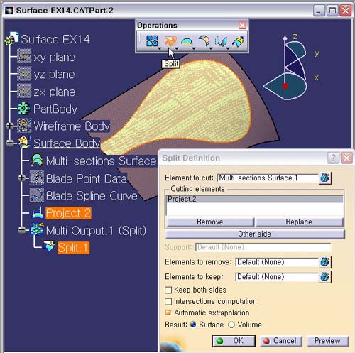 1. Split ¾ÆÀÌÄÜÀ» ¼±ÅÃÇÑ´Ù. Element To Cut : Multi-Section Surface.1 Cutting Elements : Project.2
