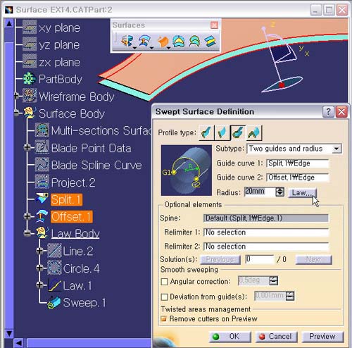 1. Sweep ¾ÆÀÌÄÜÀ» ¼±ÅÃÇÑ´Ù. Profile Type : Circle Sub Type : Two Guides And Radius Guide Curve 1 : Split.1\Edge Guide Curve 2 : Offset.1\Edge Law ¹öưÀ» Ŭ¸¯ÇÑ´Ù.