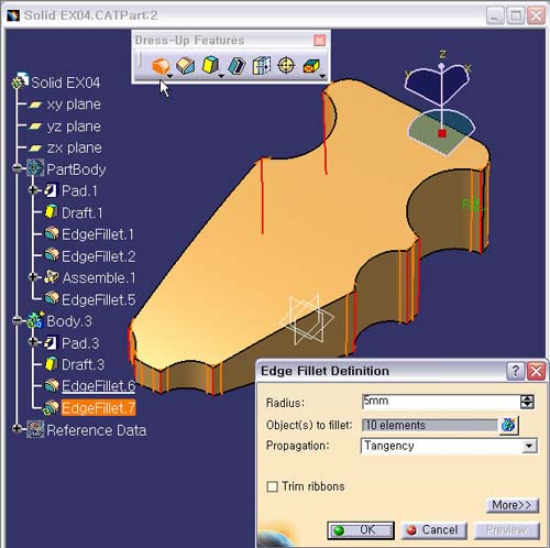 1. Edge Fillet ÀÛ¾÷Çϱâ Edge Fillet ¾ÆÀÌÄÜÀ» ¼±ÅÃÇÑ´Ù. Radius : 5mm Object(s) to fillet : ±âµÕºÎÀÇ 10°³ÀÇ ¼¼·Î Edge¸¦ ¼±ÅÃÇÑ´Ù.