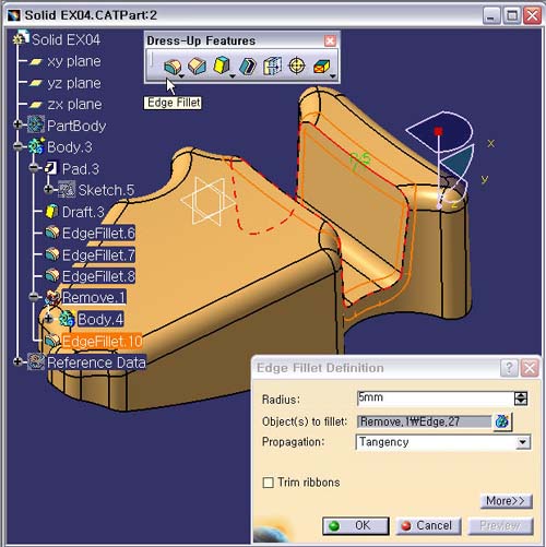 Object(s) to fillet : RemoveµÈ Á÷»ç°¢ÇüÀÇ ÇÑ Edge¸¦ ¼±ÅÃÇÑ´Ù.